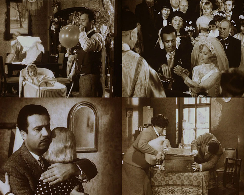 The love-triangle between Frydrych, Julie and Ptáček forms the bulk of the story, and also the basis for much of the film’s black humour. One of the hallmarks of the reversed biography is ironic reinterpretation, something that Amis makes a substantial meal of in his novel. In many cases it’s easier to do this with film than it is with words: a fight between Frydrych and Ptáček becomes an energetic “tidying up” of the apartment, with the cuckolded husband and the wife’s lover reassembling broken furniture and clearing away all the signs of destruction. Happy End is a long procession of these reversals, accompanied by Frydrych’s voiceover narration which persists in giving any tragic and difficult moments a positive gloss. Most of them, anyway. A substantial win at the racetrack becomes a negative incident when the events are played in reverse. But the loss of money is offset by Frydrych and Julie’s young daughter who pulls fresh banknotes out of an impromptu fire on the kitchen floor.