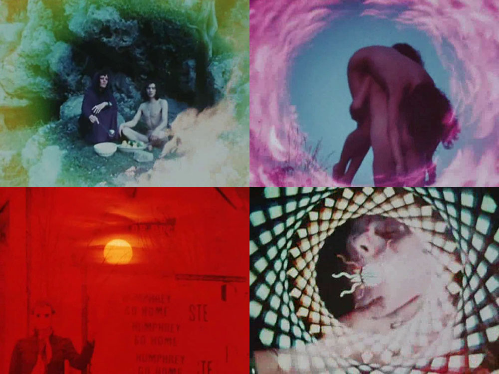 A slight return to Cyrille Verdeaux via actor Pierre Clémenti. If you watch enough European art cinema from the 1960s and 70s you’ll eventually run across Clémenti in films by Visconti, Pasolini, Buñuel, Bertolucci and others. His roles were often minor ones but his fashion-model looks made him stand out wherever he appeared. Clémenti also had a side career as a director, producing a number of mostly short films from the late 60s on. Visa de censure numéro X appears to be a product of his earliest experiments with a camera, being a collage of silent home-movie fragments which have been chopped up, filtered and overlaid to create a French hippy equivalent of Kenneth Anger’s Invocation of My Demon Brother; or maybe Derek Jarman’s early Super-8 films, although Jarman’s painterly approach to cinema tends to be more sedate.