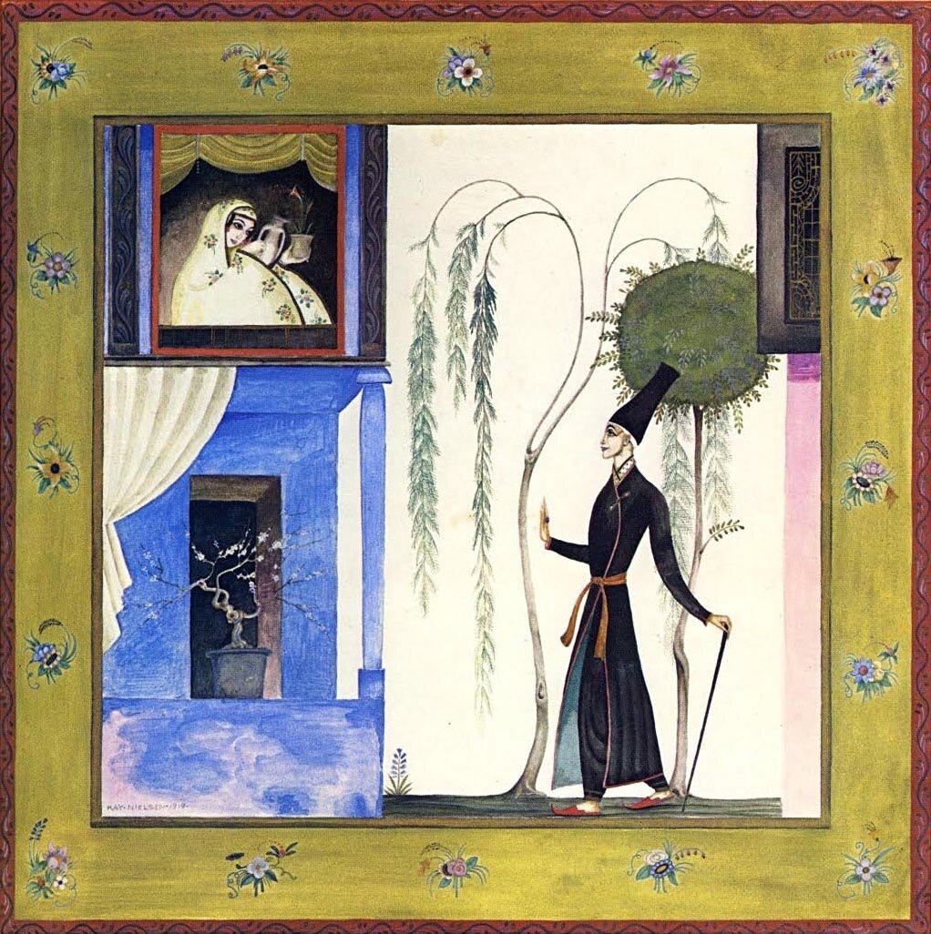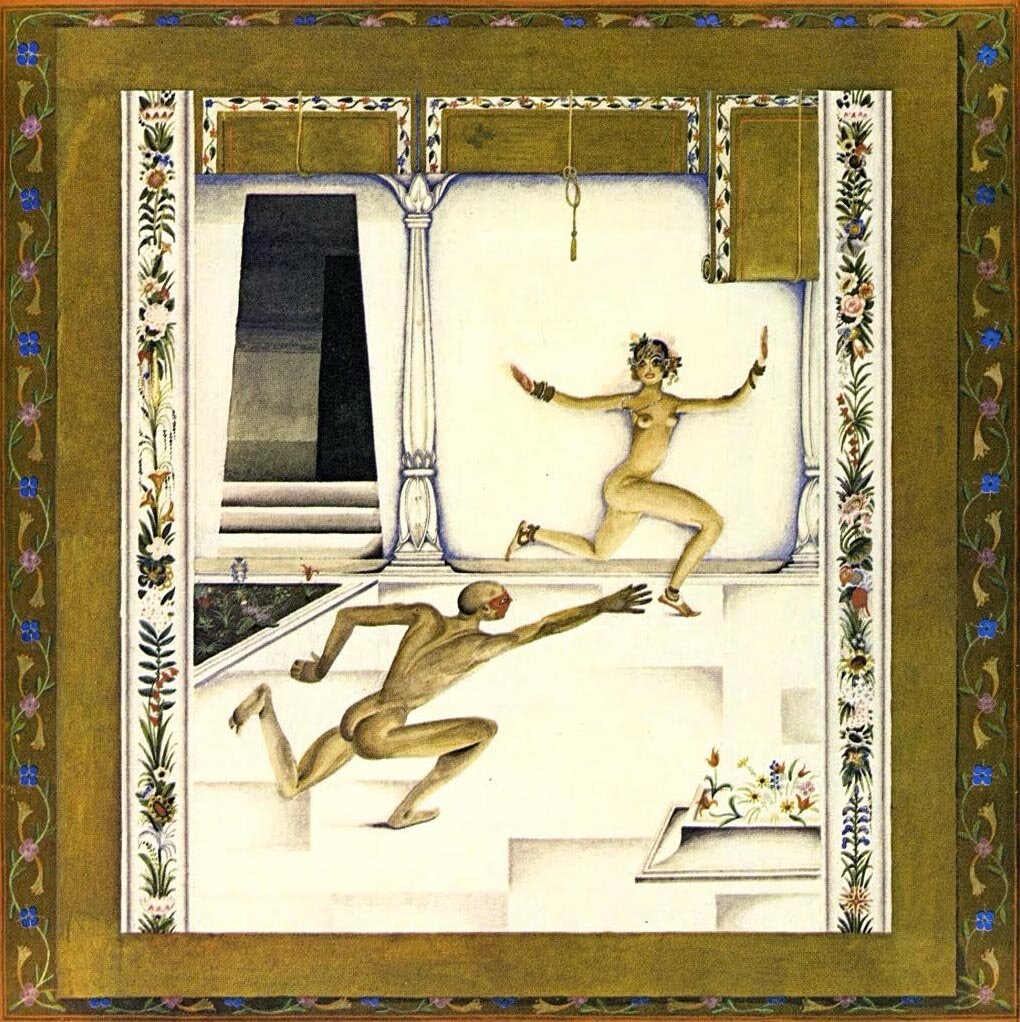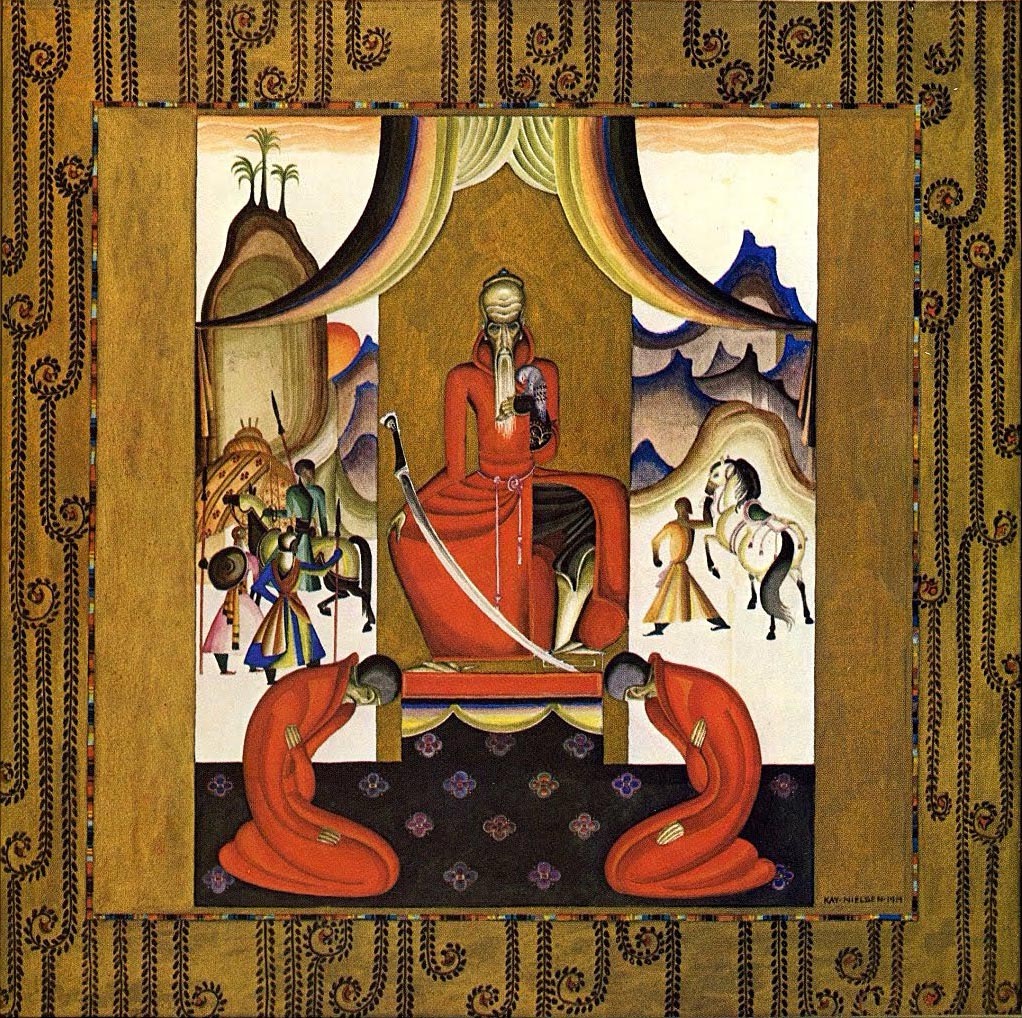 Nielsen’s illustrations in the second book were labelled “unknown” because they hadn’t been printed before, despite being commissioned for a new Danish translation of The Thousand and One Nights by Arthur Christensen. Hildegarde Flanner, a friend of the Nielsens when they were living in Los Angeles in the 1940s, writes in an introductory “elegy” that Nielsen worked on the illustrations from 1918 to 1922, but publication of the book was abandoned as a result of the economic climate in post-war Denmark. There were further difficulties later on. When Nielsen died in 1957 the illustrations still hadn’t been published. Nielsen’s widow, Ulla, passed them on to Hildegarde Flanner and Frederick Monhoff who subsequently tried to place them with museums in the USA and Denmark. None of the institutions they contacted were interested, an unthinkable situation today.