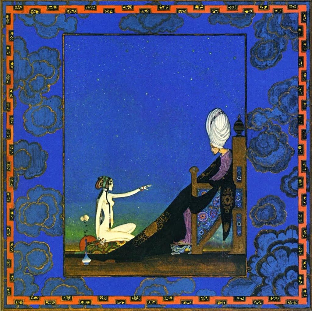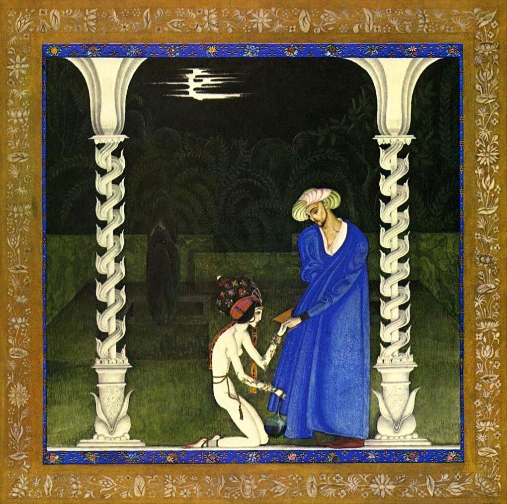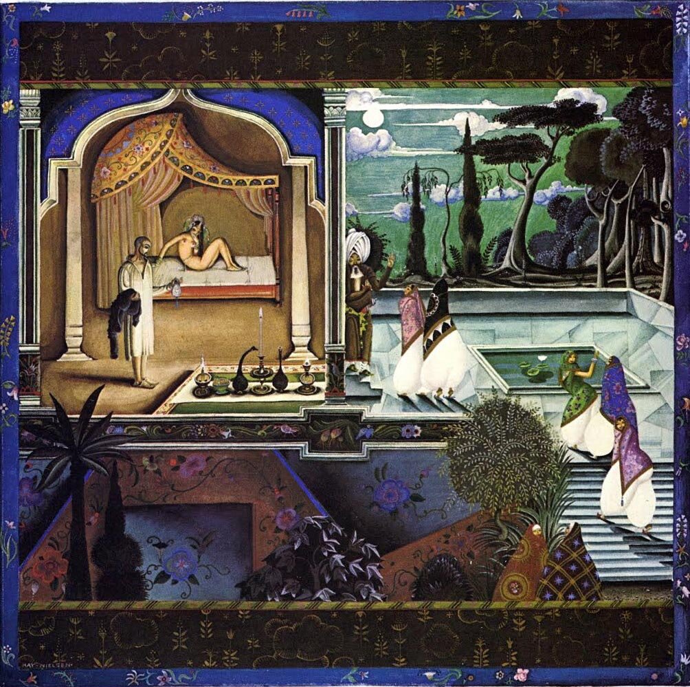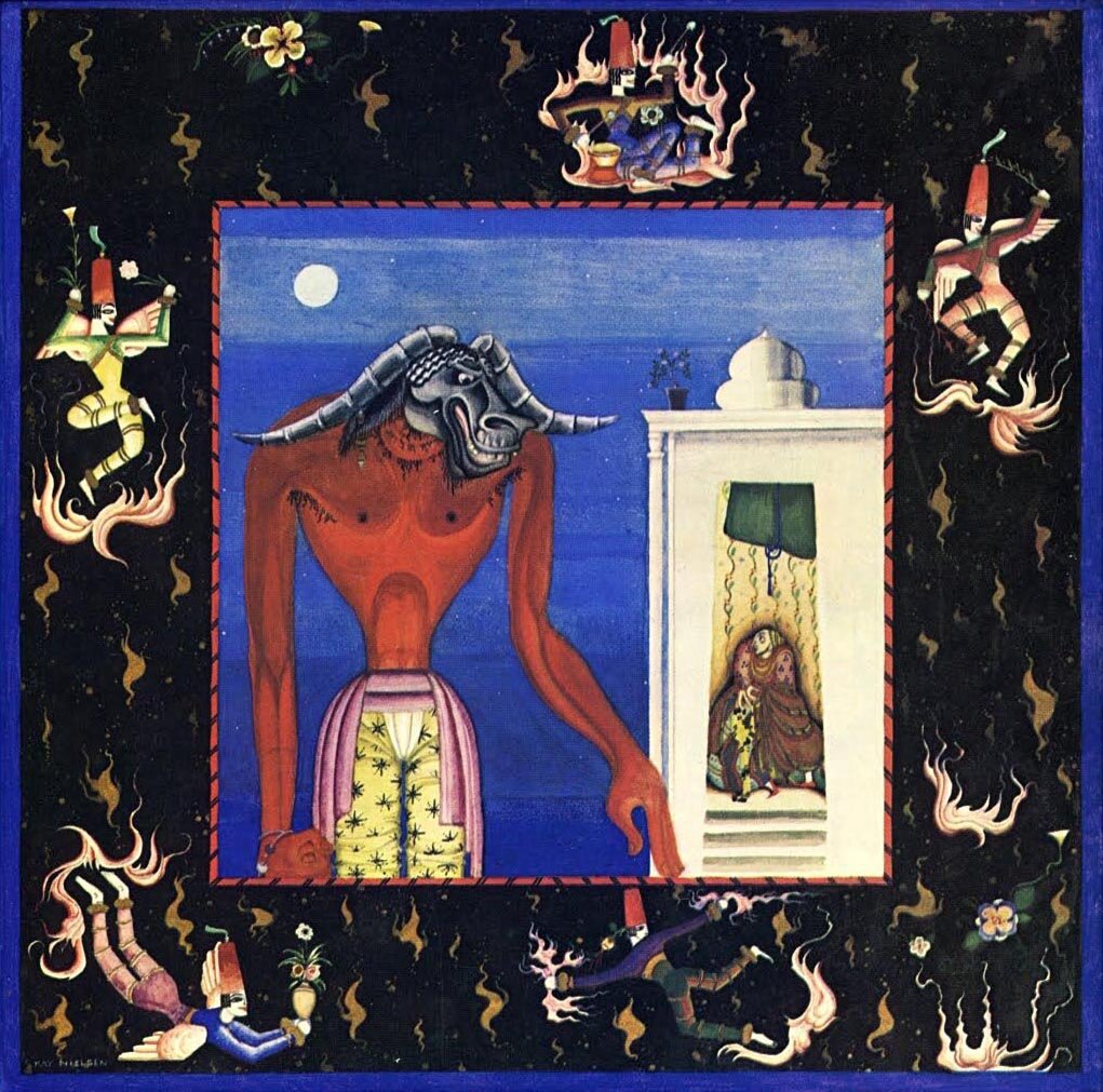 Nielsen’s illustrations in the second book were labelled “unknown” because they hadn’t been printed before, despite being commissioned for a new Danish translation of The Thousand and One Nights by Arthur Christensen. Hildegarde Flanner, a friend of the Nielsens when they were living in Los Angeles in the 1940s, writes in an introductory “elegy” that Nielsen worked on the illustrations from 1918 to 1922, but publication of the book was abandoned as a result of the economic climate in post-war Denmark. There were further difficulties later on. When Nielsen died in 1957 the illustrations still hadn’t been published. Nielsen’s widow, Ulla, passed them on to Hildegarde Flanner and Frederick Monhoff who subsequently tried to place them with museums in the USA and Denmark. None of the institutions they contacted were interested, an unthinkable situation today.