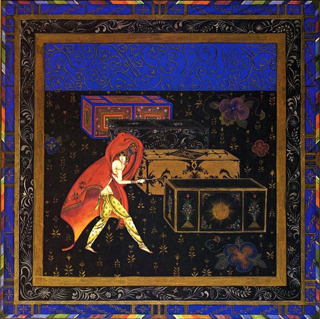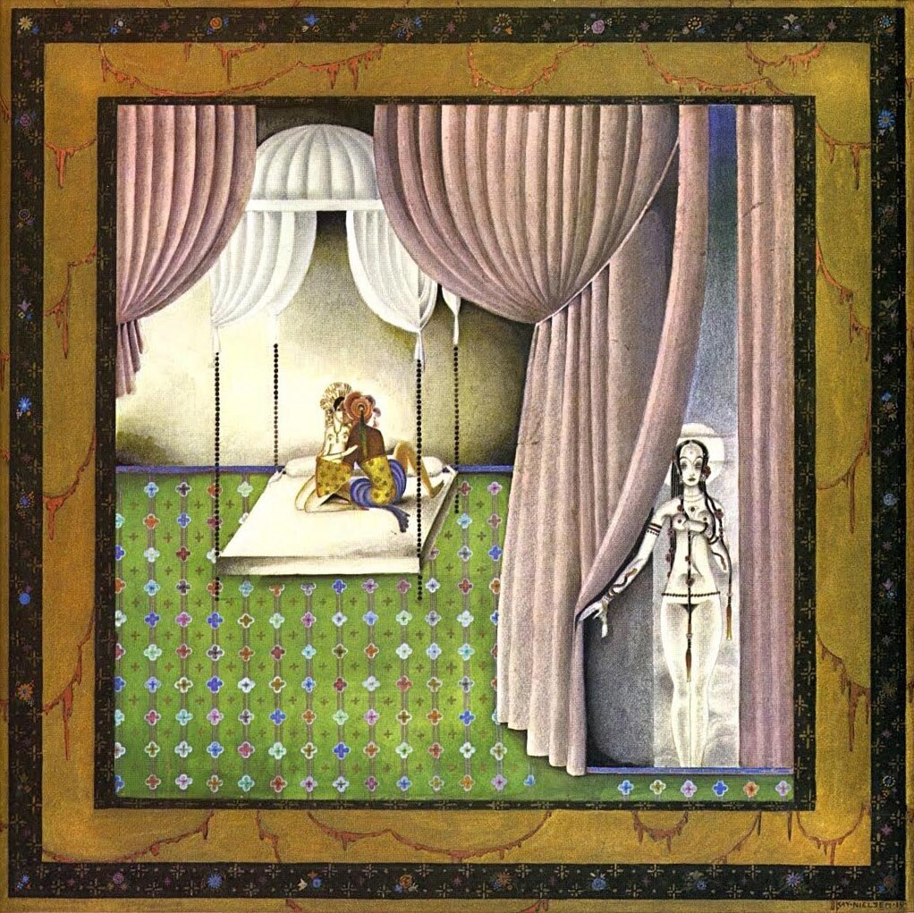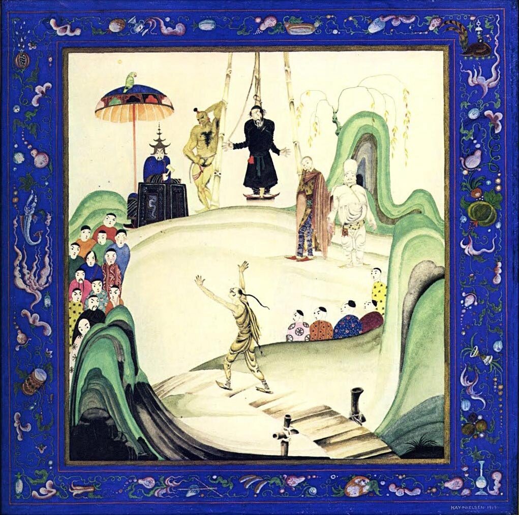 There’s more of an adult tone to Nielsen’s Arabian Nights than there is in his earlier works, a quality which suits the material but which may explain why they had to wait until the 1970s to see print. Simplified versions of the tales of Aladdin and Sin(d)bad have seen The Thousand and One Nights continually miscast as children’s fiction when the original stories were intended for adults; Scheherazade invents a new story each night to save herself from execution in the morning. Nielsen’s illustrations bring the stories closer to their origin while also maintaining the influence of Persian art on the style of his drawings.