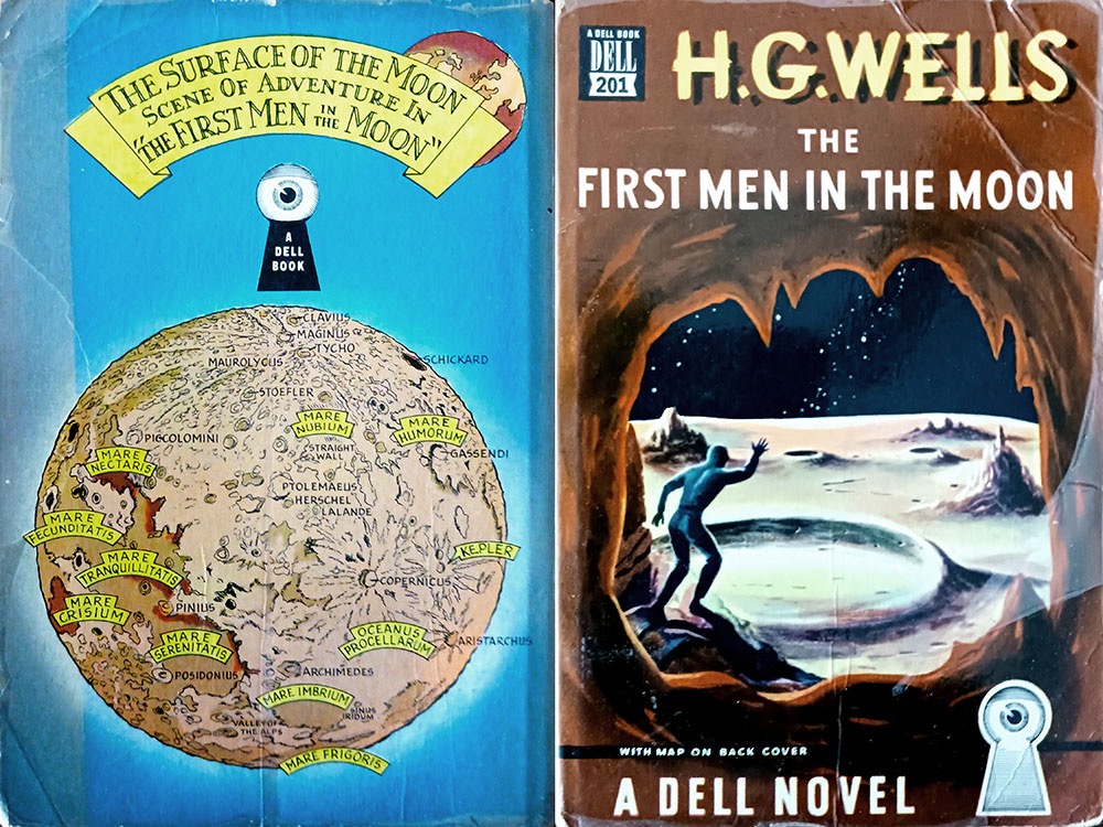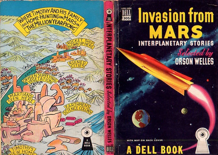 For this post I went looking for a few of the more unusual mapbacks, prompted by the discovery of Invasion from Mars. I’d been watching an Orson Welles’ question-and-answer session from 1982 which was recorded after a screening of Welles’ adaptation of The Trial. Welles declares at one point that he “used to write for the pulps, as we called them then”. The claim surprised me. I knew that Welles had been writing newspaper columns in the 1940s; he’s also credited as the author of a novel, Mr Arkadin (1955), which was actually written by a Frenchman, Maurice Bessy, whose serialised adaptation of Welles’ Mr Arkadin screen story was published in novel form. Invasion from Mars seems to be Welles’ sole encounter with pulp-land unless you include the pulpy origins of The Lady from Shanghai and Touch of Evil. Invasion from Mars collects a handful of Mars-related SF stories, together with the Howard Koch script for the Mercury Theatre radio broadcast of The War of the Worlds. The superfluous map on this occasion is for The Million Year Picnic, one of Ray Bradbury’s Martian Chronicles stories. Dell didn’t publish very much science fiction so the Mars book and First Men in the Moon are the only titles I’ve seen with maps showing extraterrestrial locations. Would-be collectors may like to know that after writing a history of the paperback book Piet Schreuders put together a short guide to collecting this series, The Dell “Mapbacks”, which was published in 1997.