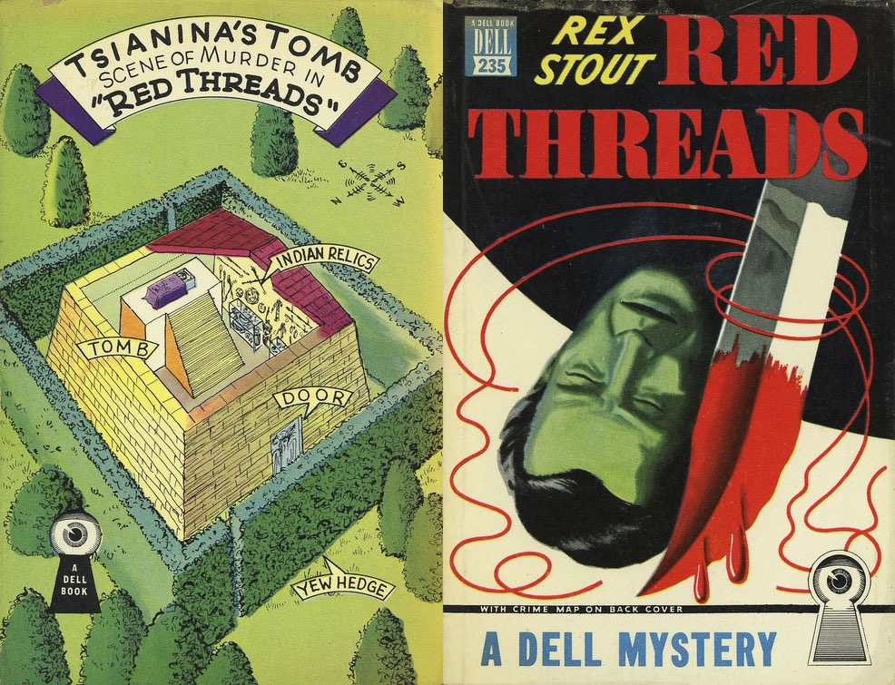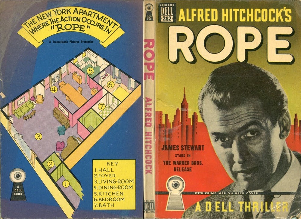 I’ve long been fascinated by the Dell Mapbacks even though I’ve only ever seen pictures of them. (And to stave off the inevitable emails: no, I don’t want to buy any.) They form a truncated path in the evolution of the paperback book, one where the gimmick of creating a map for each title was globally applied, regardless of whether the contents warranted such a thing. Dell began life as a publisher of mysteries, hence the logo of an eye peeping through a keyhole. Maps are more justifiable if applied to a detective story, where a map may help the reader picture the layout of a location or trace the movements of a character. But once Dell branched out into other areas of fiction the maps seemed increasingly superfluous, especially those that limit themselves to the plan of an office or apartment. For some there’s also the question of accuracy. The novelisation of Alfred Hitchcock’s Rope shows a map of the apartment that doesn’t correspond to the layout of the rooms as they’re seen on the screen, something that readers who’d seen the film would have been quick to recognise.