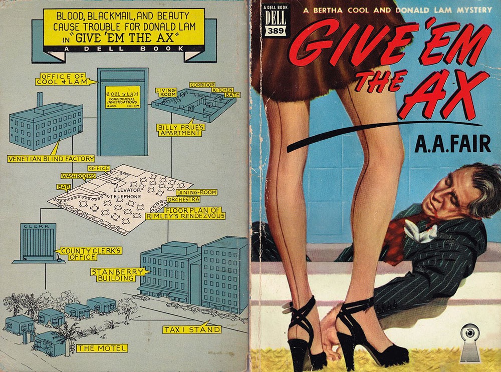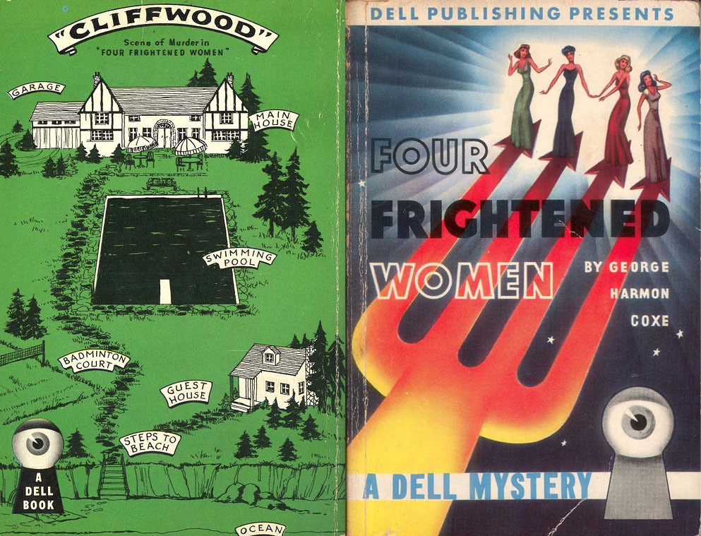 Dell 5, Four Frightened Women by George Harmon Coxe, was the first of the mapbacks. On the back cover of each of these books is, naturally, a map—a cutaway bird’s-eye view of the apartment building, house, hotel or city-section in which the events of the book take place. These drawings were generally quite faithful to the books; the most careful one was probably the map sketched by author Hake Talbot for his own book, Rim of the Pit (Dell 173), and executed, as were most of the mapbacks, by Ruth Belew.