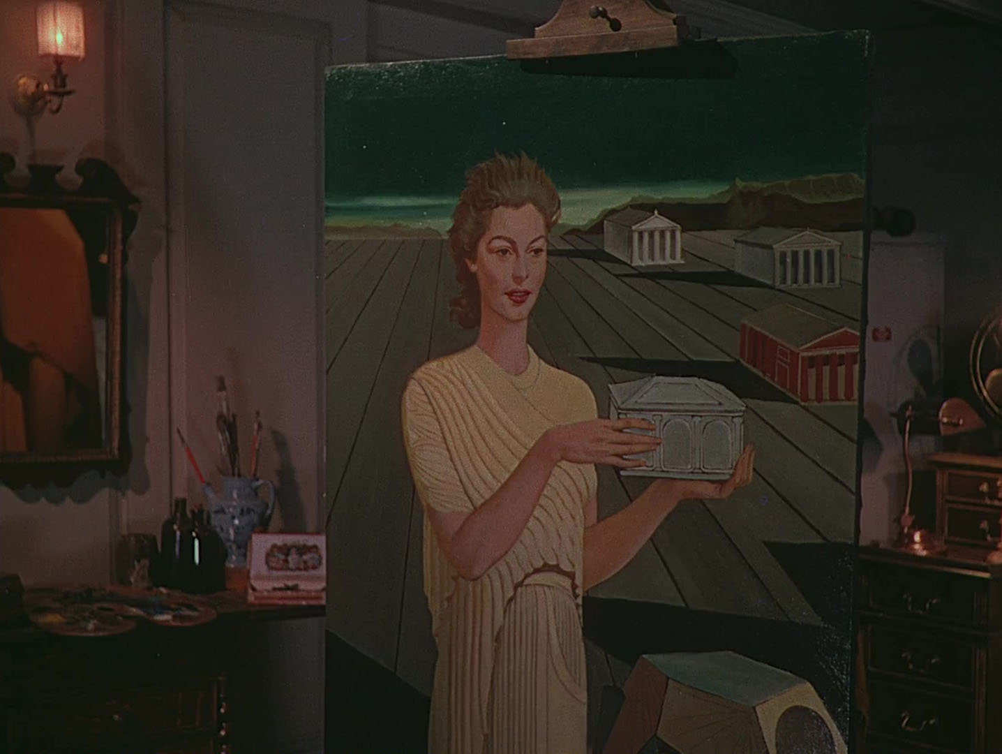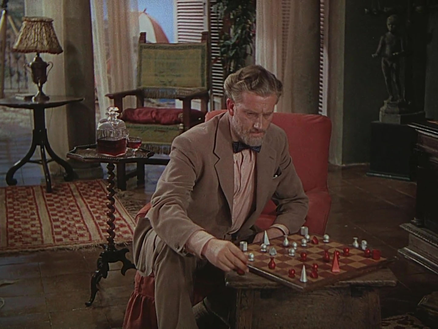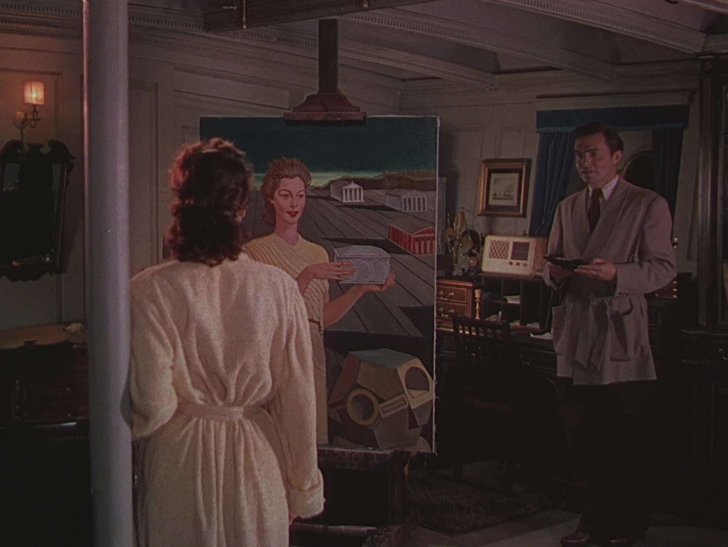 This is slight stuff but it makes a change from all those films where artist characters in 20th-century settings are either creating portraits that owe more to the previous century or Philistine caricatures of “modern art”, like the faux-Dalí painting that appears in Crack-Up. Man Ray was a friend of Albert Lewin, and is credited with having worked on the film although in what capacity isn’t entirely clear. This essay by Kimberly Lindbergs claims that the de Chirico-style portrait was the work of set artist Ferdinand Bellan; if so the picture was following a sketch by the artist. The same essay shows a promotional still with Ava Gardner and Man Ray posed with a different Pandora painting from the one in the film, which suggests that Man Ray’s portrait wasn’t a good enough likeness. The film does, however, feature an anachronistic photograph by Man Ray of van der Zee’s dead wife; also a brief glimpse of a Man Ray-designed chess set in the home of Geoffrey Fielding, a British archaeologist who discovers the true nature of van der Zee’s identity.