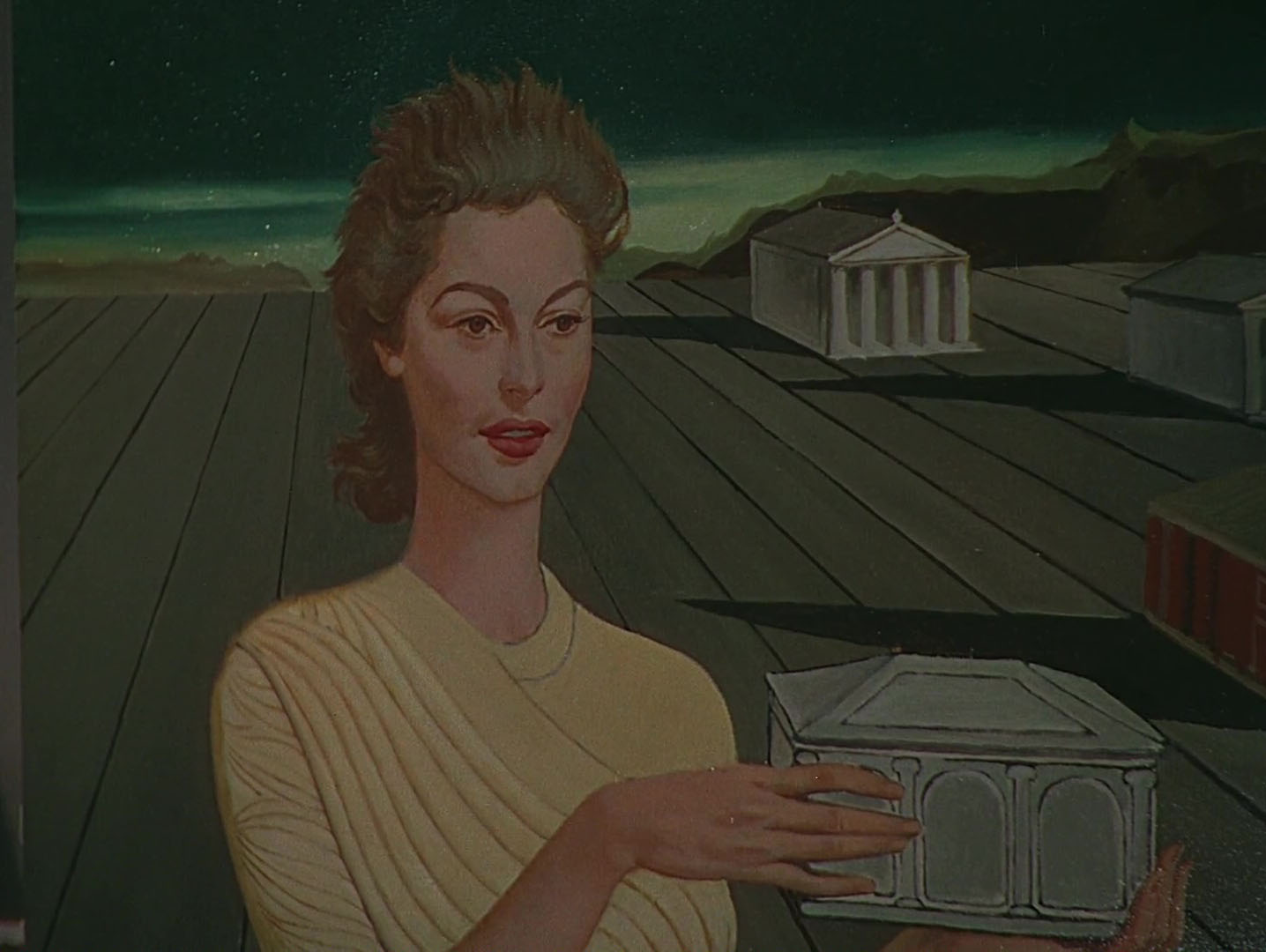 The key connection to Ballard is Surrealist (or-pre-Surrealist) painting, a detail of Pandora and the Flying Dutchman that I’d forgotten all about. Albert Lewin only directed six films; he also wrote each one, and was very determined in his attempts to bring a touch of artistic class to Anglophone cinema. Pandora and the Flying Dutchman was his fourth feature after The Moon and Sixpence and The Picture of Dorian Gray—each an adaptation of a novel where painting is an important element of the story—and The Private Affairs of Bel Ami, a film that was promoted with a Surrealist painting competition on the theme of the temptation of St Anthony. Max Ernst won the competition, and his picture appears at the end of the film, a colour insert in an otherwise black-and-white feature. Lewin did the same for The Picture of Dorian Gray, another black-and-white film where the portrait paintings (including Ivan Albright’s unforgettably corrupted canvas) are shown in colour inserts.